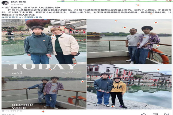为进一步增强传承中华民族传统美德的责任意识,营造和谐美满的家庭氛围,让“加长版假期”更有意义。5月18日至5月22日,马克思主义学院(法学院)组织开展“‘照’见成长,分享温情时刻”活动。
