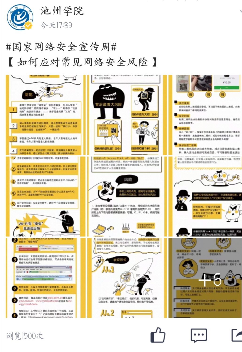 学校利用两微一端平台积极做好线上宣传工作。在必赢76net线路官网微信公众号、校园空间号、微博等网络平台上推出关于网络安全防范的相关知识,通过漫画的形式讲述了如何防范电信诈骗、恶意二维码、假冒热点、钓鱼网站等网络隐患,提醒广大师生注意个人信息的保护。