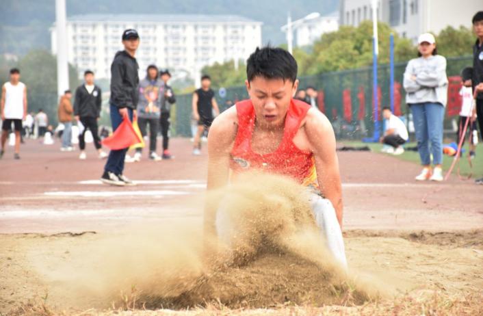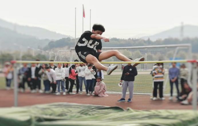 跳远运动员起跑、落定,在空中划过一个漂亮的弧线,在跃向空中的一瞬间,跳出了自信与荣耀。