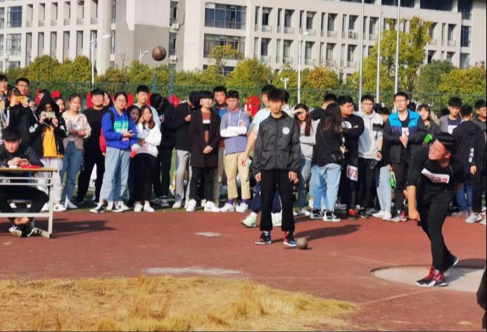 铅球比赛选手神采奕奕,意气风发,不断调试着投掷的姿势,以寻找最佳状态,伴随着一声铿锵有力的呐喊,铅球被远远掷出。