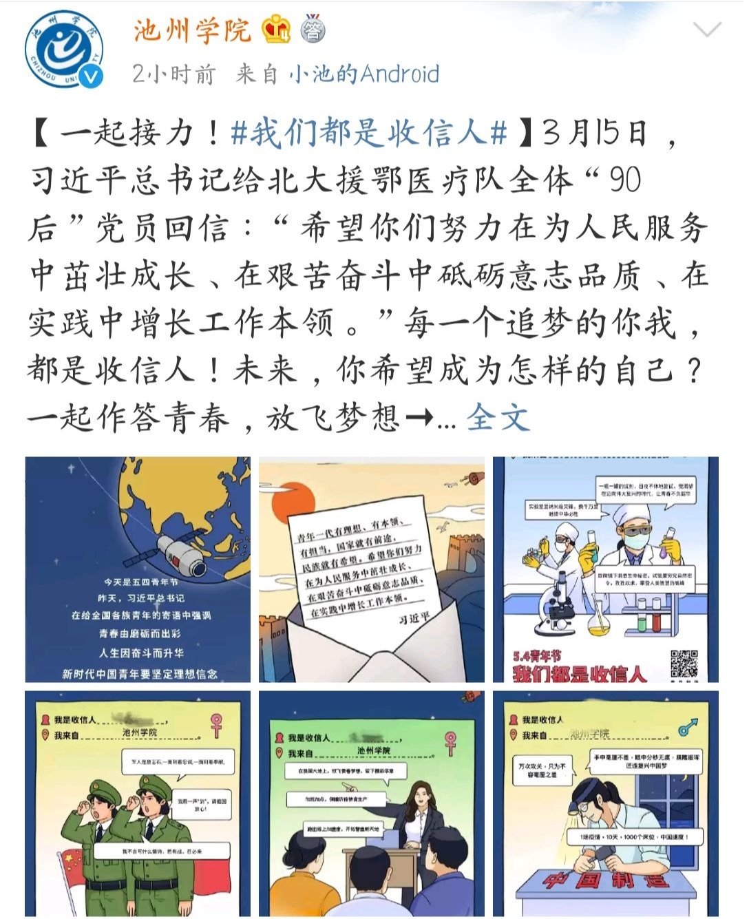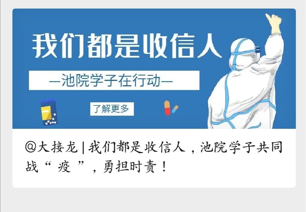 活动期间,学校官方新媒体编发了推文《@大接龙|我们都是收信人,池院学子共同战“役”,勇担时责!》,从“说、写、拍、画、唱、行”等角度讲述必赢官网青年学子在疫情防控中,积极响应党的号召,用实际行展现了当代大学生的使命感和责任感。