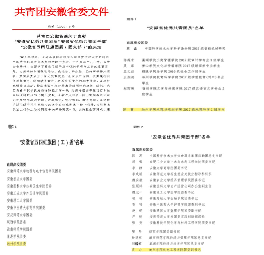 近日,共青团安徽省委下发了《共青团安徽省委关于表彰“安徽省优秀共青团员”“安徽省优秀共青团干部”“安徽省五四红旗团委(团支部)”的决定》(皖青〔2020〕6号)文件,必赢官网团委荣获“安徽省五四红旗团委”荣誉称号,机电工程学院团委副书记袁力获“安徽省优秀共青团干部”荣誉称号,地理与规划学院2017级地理科学1班陈蕾获“安徽省优秀共青团员”荣誉称号。