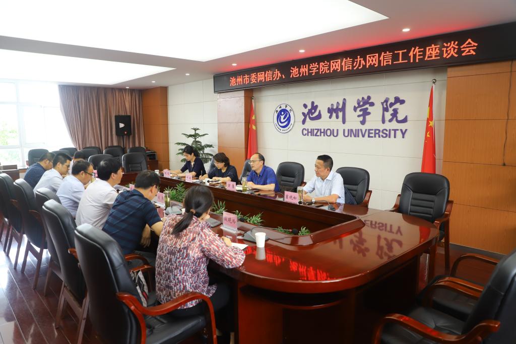 5月27日,池州市委网信办到必赢官网调研指导网信工作,双方就网络安全和信息化建设进行座谈。校党委书记孙晓峰,党委副书记崔国发接待了市委网信办主任方勇一行。座谈会由校党委委员、宣传部长、网信办主任胡兵主持。