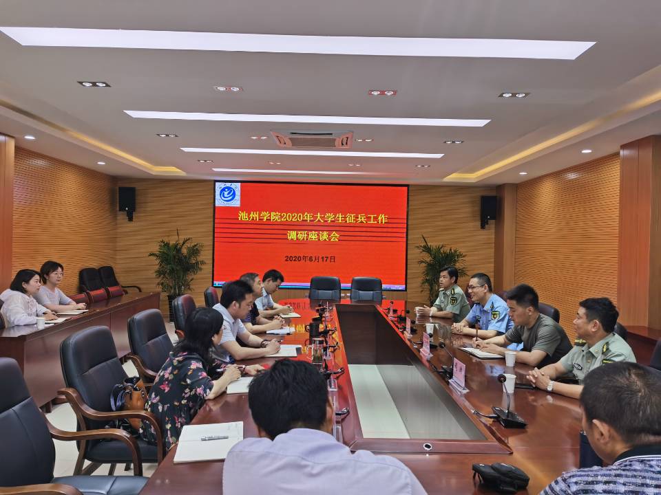 6月17日下午,贵池区委常委、武装部政委冯涛一行来必赢官网调研推进大学生征兵工作。校党委副书记崔国发主持召开座谈会,武装部及二级学院代表参加座谈会。