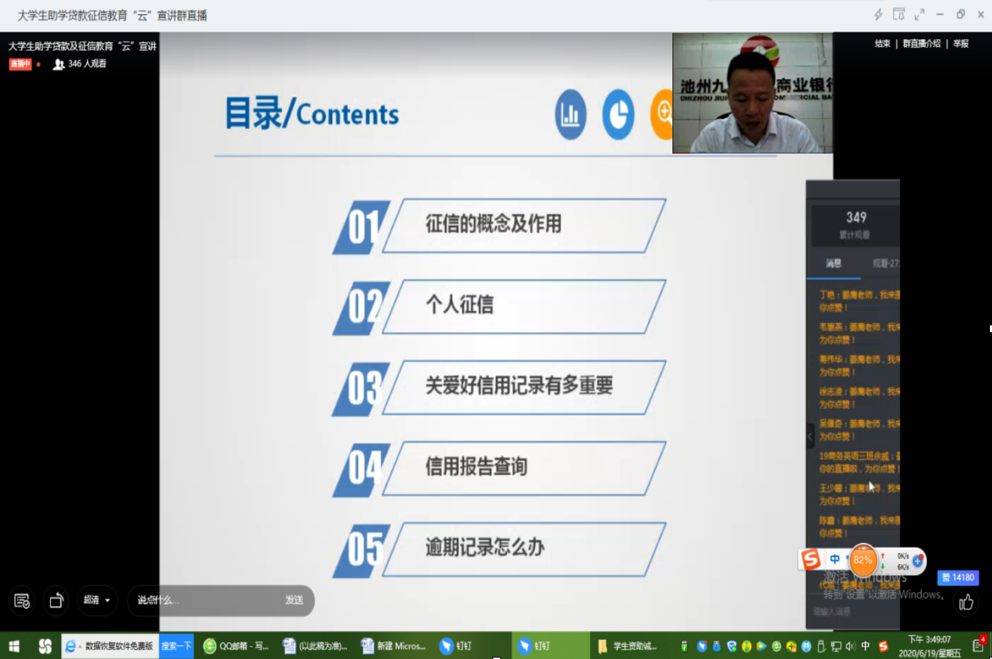在直播平台上,九华农商行秋浦支行副行长姜鹰、客户经理王琳以网为媒,通过详细的政策解读、生动的案例警示向同学们全面介绍了国家助学贷款信贷政策、还款流程、贷款常见问题,讲授了征信知识、逾期风险、如何建立良好信用以及防范非法集资、远离不良“校园贷”等金融知识。同学们积极参与,线上互动,反响热烈。