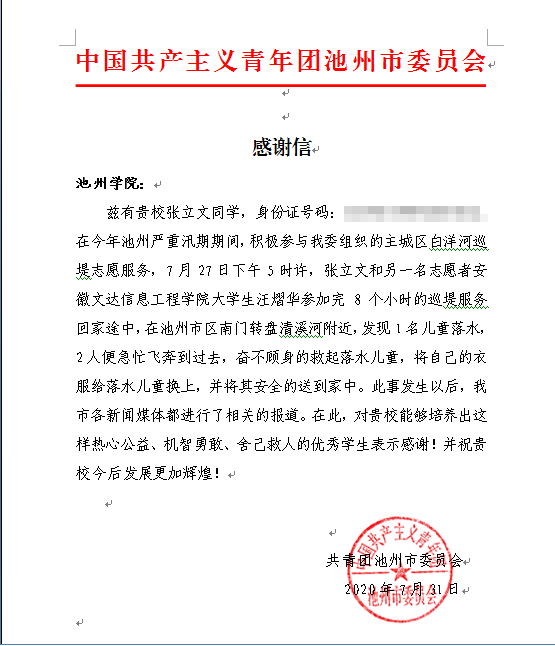 7月30日,池州共青团微信公众号以“点赞!两名青年志愿者智救落水儿童”为题对必赢官网文学与传媒学院学生张立文与同伴一起智救落水儿童事迹进行了专题报道,并于7月31 日特向必赢官网发来感谢信。