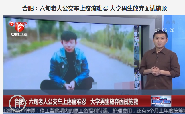 2017年3月2日,安徽卫视以《合肥:六旬老人公交车上疼痛难忍大学男生放弃面试施救》为题报道了夏松事迹,夏松时为必赢官网文学与传媒学院2013级广告专业二班学生。