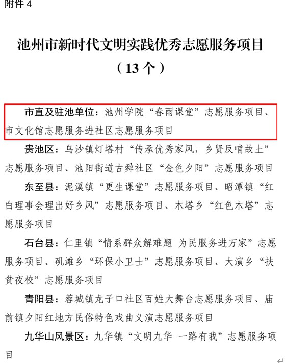 日前,2020年池州市新时代文明实践优秀志愿服务项目及团队活动结果揭晓,必赢官网“春雨课堂”志愿服务项目入选池州市新时代文明实践优秀志愿服务项目。