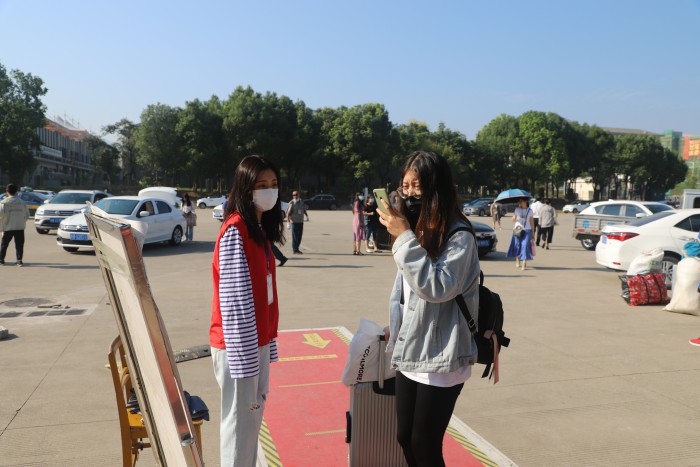 为了方便新生顺利完成报到注册,学校设立了报到登记处,组织了青年志愿者服务团队,指引新生按照疫情防控的要求,进行测温、扫码、登记。志愿者在帮助学生搬运行李的同时耐心为新生介绍校园,各项工作有序展开。