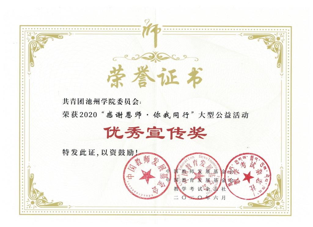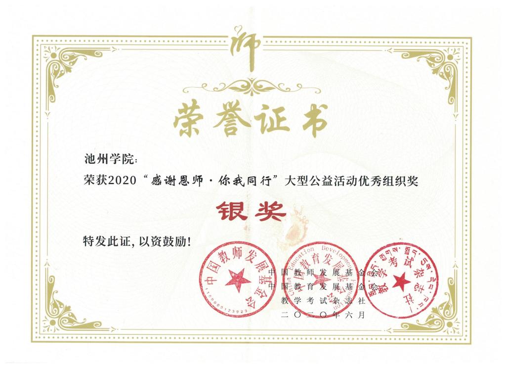近日,2019年度“感谢恩师·你我同行”大型公益活动圆满结束,必赢官网荣获全国“优秀组织奖银奖”、全国“优秀宣传奖”等荣誉称号,文学与传媒学院叶静同学荣获全国“优秀传承奖”,外国语学院周红同学、旅游与历史文化学院陈蓉同学荣获“优秀感恩大使”荣誉称号。