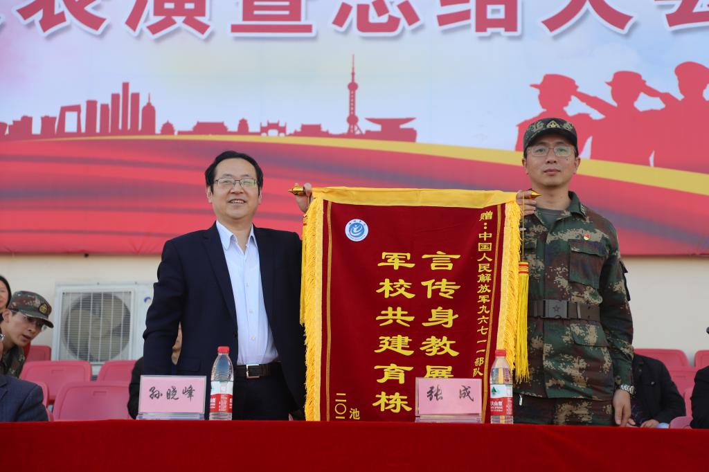 孙晓峰代表全校师生向承训部队赠送锦旗,向部队首长及全体教官表示崇高的敬意和衷心的感谢。他指出,军训期间,教官们以雷厉风行的军人作风、忘我工作的奉献精神,集中体现了人民军队的光荣传统、优良作风和高贵品质。军训的圆满结束意味着大学生活的全面开启,全体新生要以昂扬的斗志迎接崭新开始,创造无愧于青春的大学生活,展示朝气蓬勃、奋发向上的时代风采。