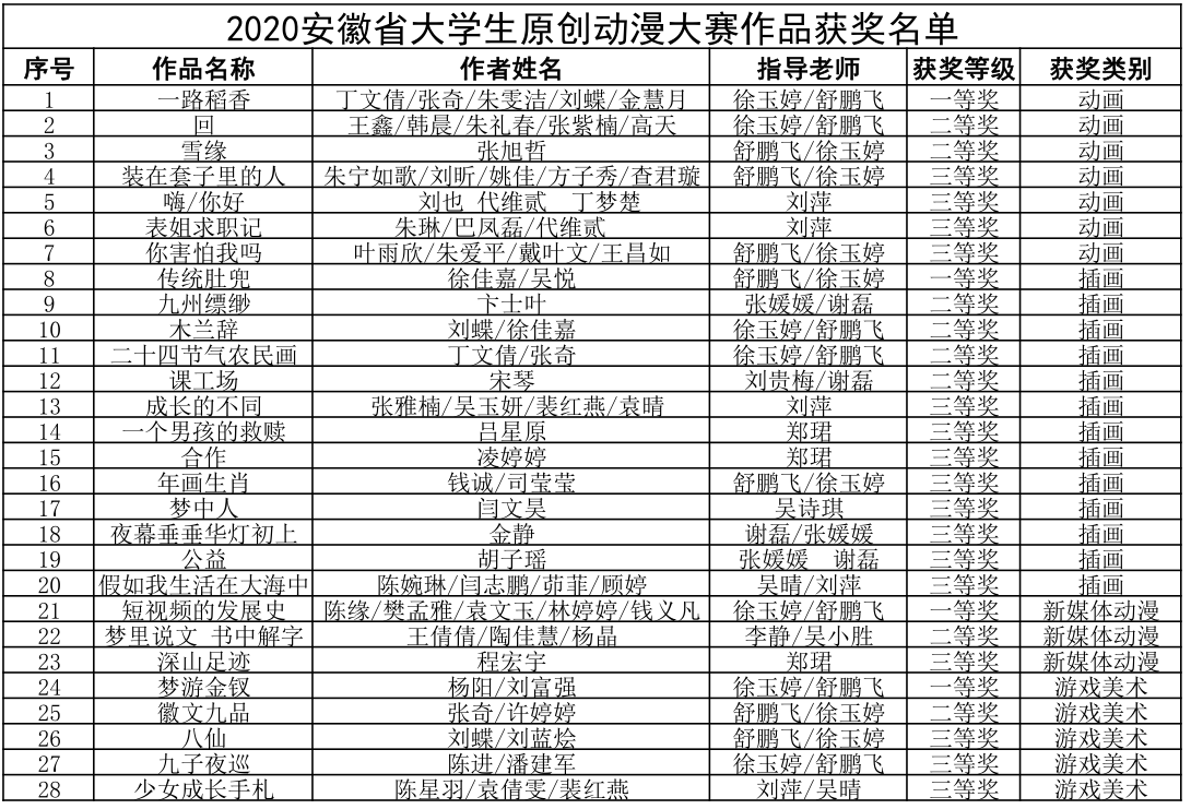 获奖作品中,由丁文倩等同学创作的动画类作品《一路稻香》(指导教师:徐玉婷、舒鹏飞)、徐佳嘉等同学创作的插画类作品《传统肚兜》(指导教师:舒鹏飞、徐玉婷)、陈缘等同学创作的新媒体动漫类作品《短视频的发展史》(指导教师:徐玉婷、舒鹏飞)、杨阳等同学创作的游戏美术类作品《梦游金钗》(指导教师:徐玉婷、舒鹏飞)荣获一等奖,徐玉婷和舒鹏飞两位指导教师荣获优秀指导教师称号。