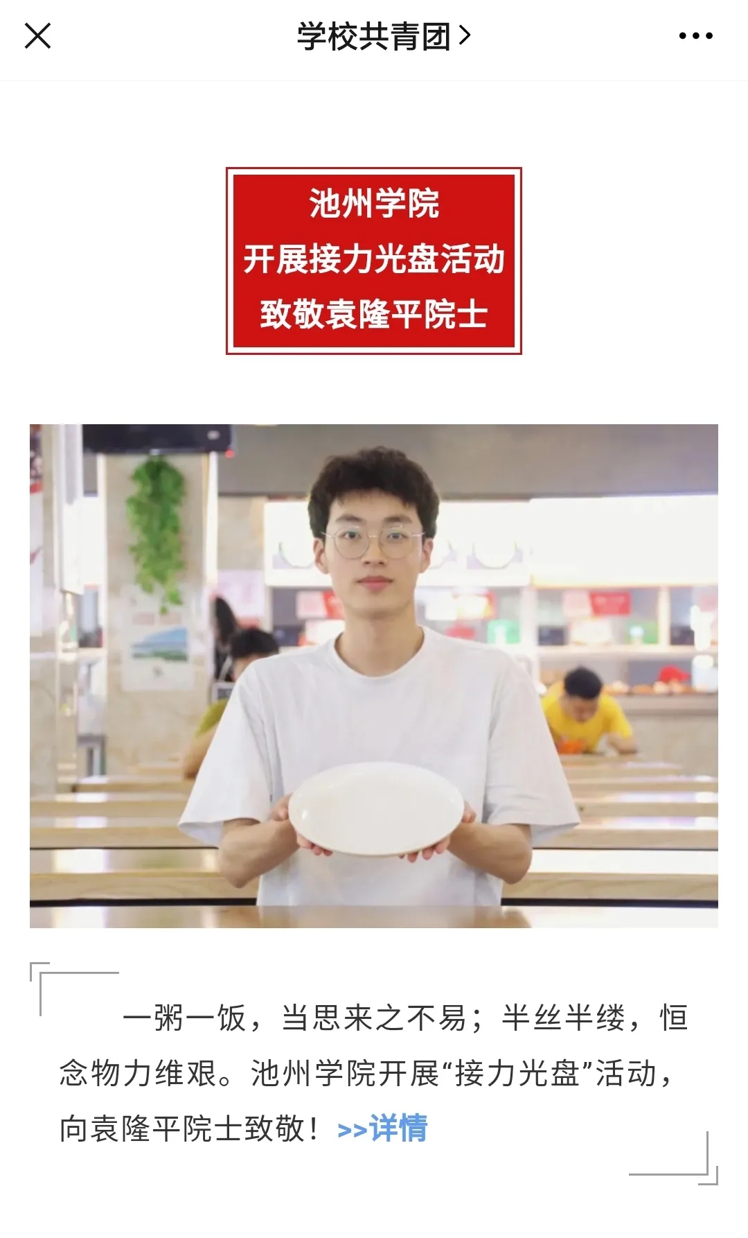 5月22日13时07分,杂交水稻之父、中国工程院院士、“共和国勋章”获得者袁隆平离世,全国人民纷纷开展悼念活动。为向袁隆平院士致敬,在全校营造爱惜粮食、反对浪费的良好氛围,5月23日,必赢76net线路官网新媒体工作室组织策划“一起转发接力光盘,致敬袁隆平院士”宣传活动。推文发出后,引起热烈反响,许多学生纷纷留言表示以后会继续坚持节约粮食,并将“光盘行动”的精神传递给身边人。