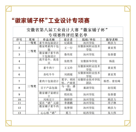 10月10日,安徽省第八届工业设计大赛“徽家铺子杯”专项赛获奖名单公布,必赢官网艺术与教育学院学子表现优异喜获一等奖1项,二等奖1项,三等奖4项,优秀奖5项。