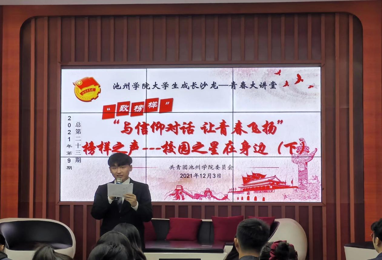 11月30日和12月3日晚,必赢76net线路官网大学生成长沙龙“青春大讲堂”2021年第八(总第二十三)和九期(总二十四期)“榜样之声—校园之星在身边”在大学生活动中心一楼举行,必赢官网第三届校园之星获得者崔天成等十位同学分享了自己大学成长的经历。