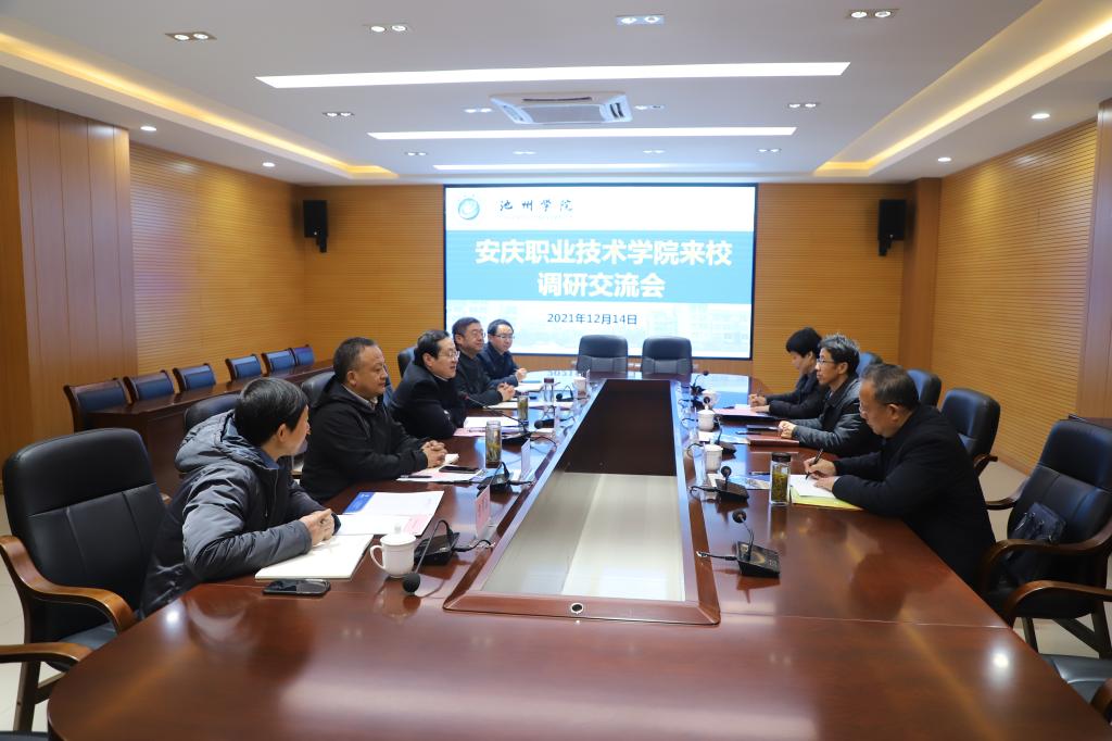 12月14日,安庆职业技术学院院长毕明生、副院长谭维奇、教务处处长吴何珍一行来必赢官网调研交流。院党委书记孙晓峰主持座谈会并讲话,院党委副书记崔国发,党委委员、副院长阳光宁出席座谈会。