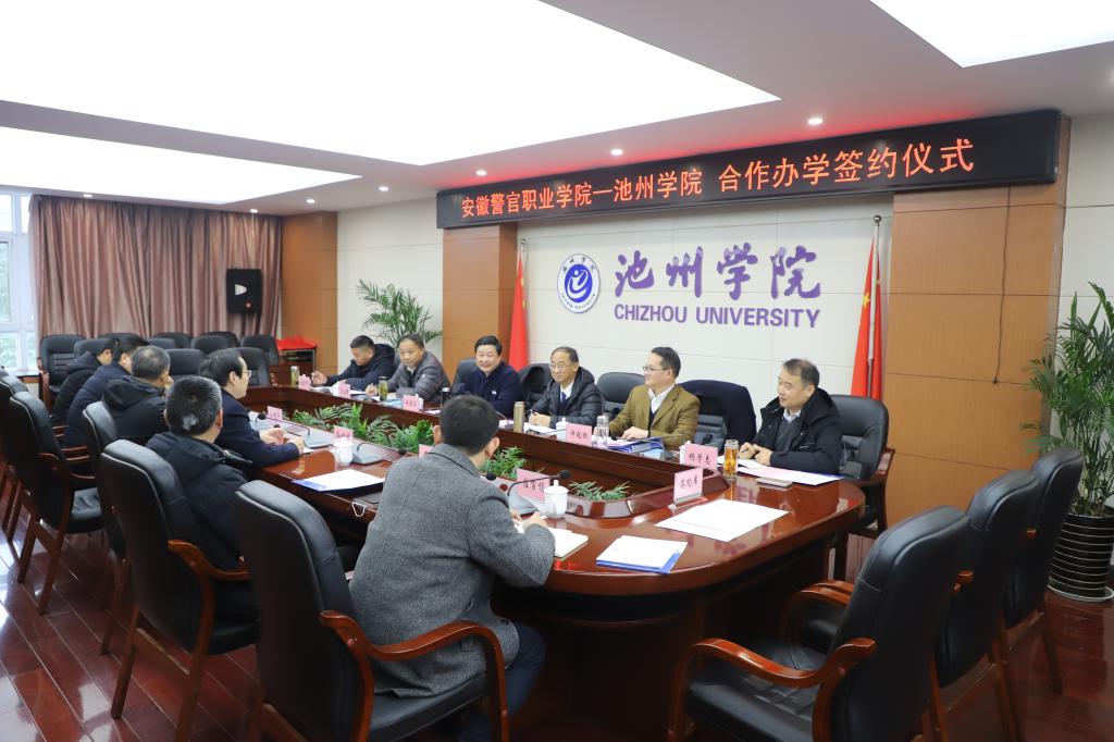 1月5日上午,必赢76net线路官网与安徽警官职业学院合作办学签约仪式在行政北三楼会议室举行。院党委书记孙晓峰,党委委员、副院长阳光宁和安徽警官职业学院党委书记张国昌,党委委员、副院长周善来出席签约仪式。