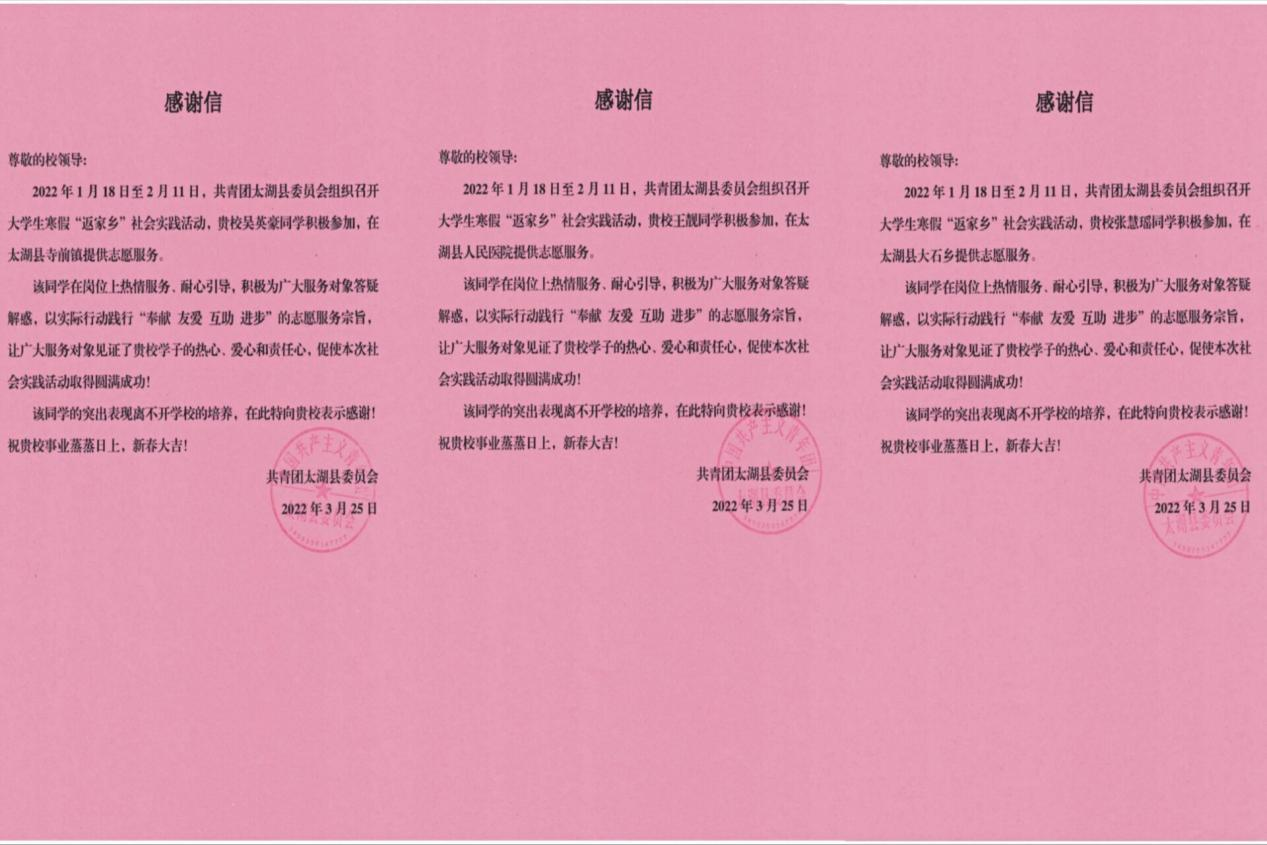 近日,必赢官网收到共青团太湖县委员会发来的感谢信,表扬必赢官网体育学院2020级社会体育指导与管理二班学生吴英豪、地理与规划学院2021级地理科学三班学生王靓、商学院2021级电子商务(对口班)学生张慧瑶等积极参加2022年寒假“返家乡”社会实践活动,勇于担当、积极奉献,用实际行动彰显了新时代大学生的责任与担当,并对必赢官网的培养教育表示感谢。