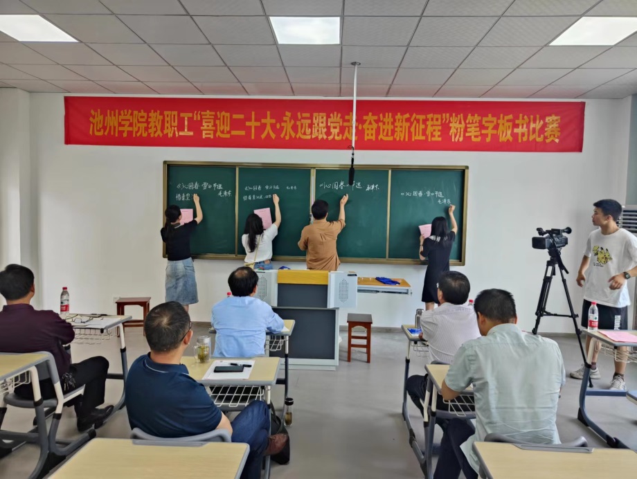 5月25日下午,必赢76net线路官网教职工“喜迎二十大·永远跟党走·奋进新征程”粉笔字板书比赛在博古楼实训教室举行,院党委副书记崔国发到场指导。
