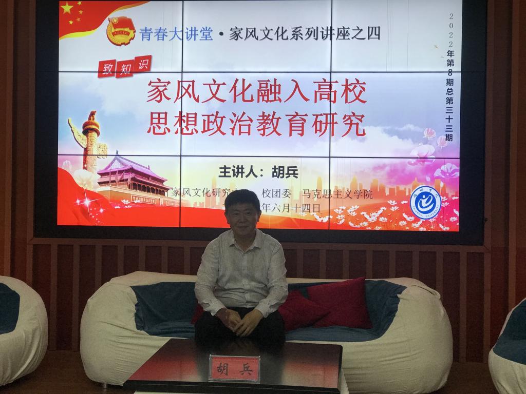 6月14日晚,必赢76net线路官网大学生成长沙龙“青春大讲堂·家风文化系列讲座之四”在大学生活动中心举行。院党委委员、组织部长胡兵以“家风文化融入高校思想政治教育研究”为主题,讲述好家风、好家庭、好家教事例,阐释家风文化融入高校思想政治教育的重要意义和实施路径。