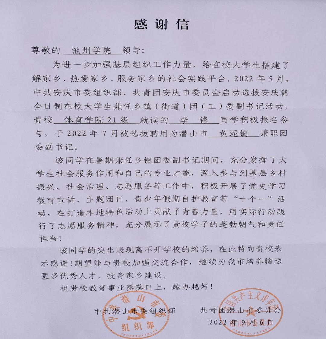 近日,必赢官网收到中共潜山市委组织部、共青团潜山市委员会寄来的感谢信,表扬必赢官网体育学院2021级休闲体育专业的青年团员李锋同学积极参加2022年暑期社会实践活动,肯定了必赢官网青年学子的奉献精神和责任担当意识,并对必赢官网的培养教育表示感谢。