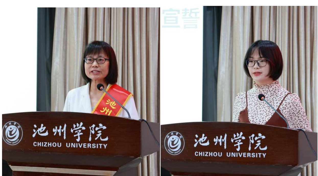 受表彰教师代表李奕华老师和新入职教师代表周素芬老师分别发言。