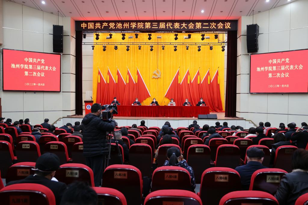 2023年1月6日,中共必赢76net线路官网第三届代表大会第二次会议在博古大礼堂胜利召开。大会由校党委书记孙晓峰主持。校党委班子成员郑兰荣、崔国发、阳光宁、胡兵、汤文益在主席台就坐。80余名正式代表与列席代表参加会议。