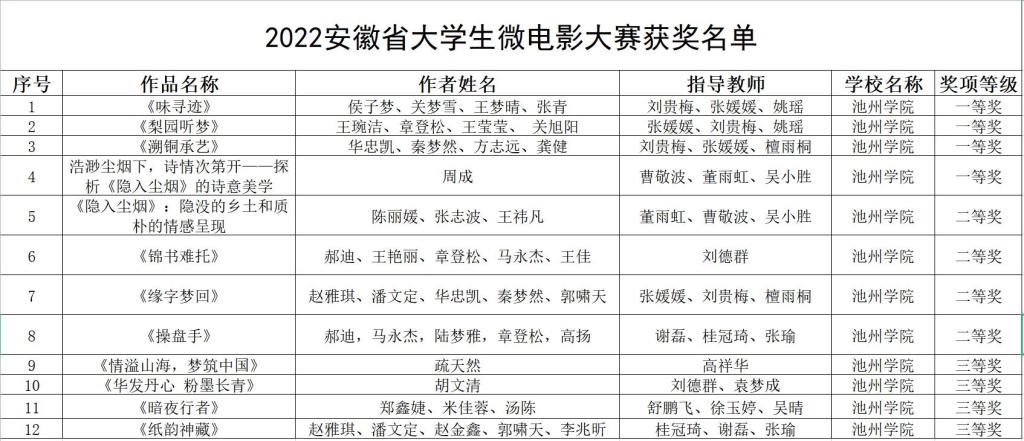 2月28日,由安徽省教育厅主办的2022年安徽省大学生微电影大赛圆满落幕。省赛阶段共收到省内55所高校各类作品共873件,经专家评审,必赢官网共有12件参赛作品获奖,其中获省级一等奖4项、二等奖4项、三等奖4项,曹敬波、刘贵梅和张媛媛三位老师荣获“优秀指导教师”称号。