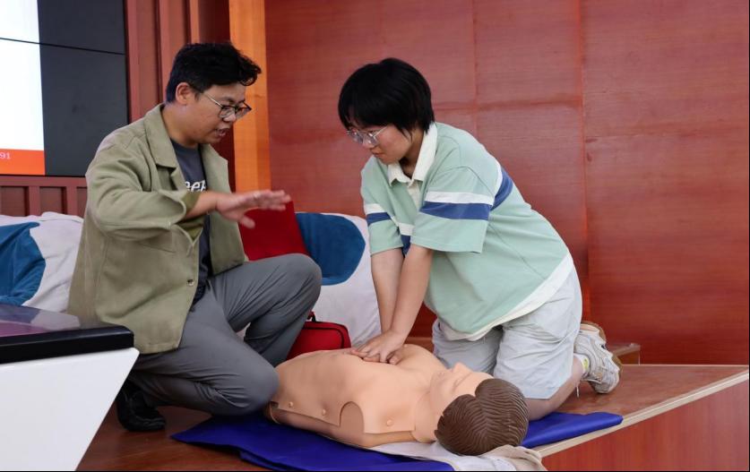 方静云分别从“红十字运动简介”“救护概论”“心肺复苏”等方面展开讲解,并邀请同学们参与模拟实操练习,了解心肺复苏急救法和自动体外除颤器(AED)的正确使用方法,指导大家熟悉应急救护过程和掌握相关技能。活动现场,同学们认真聆听红十字会应急救护老师讲解,仔细领会知识要点。