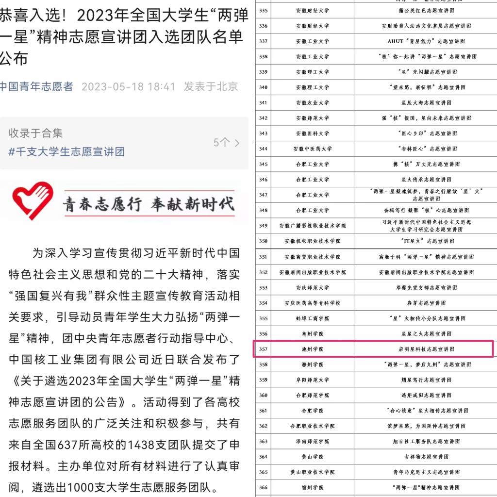 5月18日,团中央青年志愿者行动指导中心、中国核工业集团有限公司联合发布了《关于遴选2023年全国大学生“两弹一星”精神志愿宣讲团的公告》,必赢官网材料与环境工程学院组织申报的“启明星科技志愿宣讲团”成功入选。