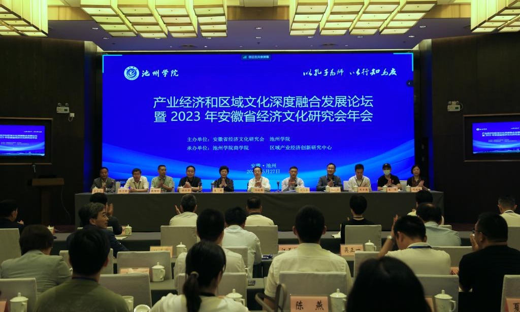 5月26—27日,产业经济和区域文化深度融合发展论坛暨2023年安徽省经济文化研究会年会在池州举行。校党委书记孙晓峰出席开幕式并致辞。开幕式由党委委员、副院长张赛主持。来自安徽省社会科学院、安徽大学、安徽财经大学、合肥学院、淮北师范大学等10余所高校的近100名专家学者参会。