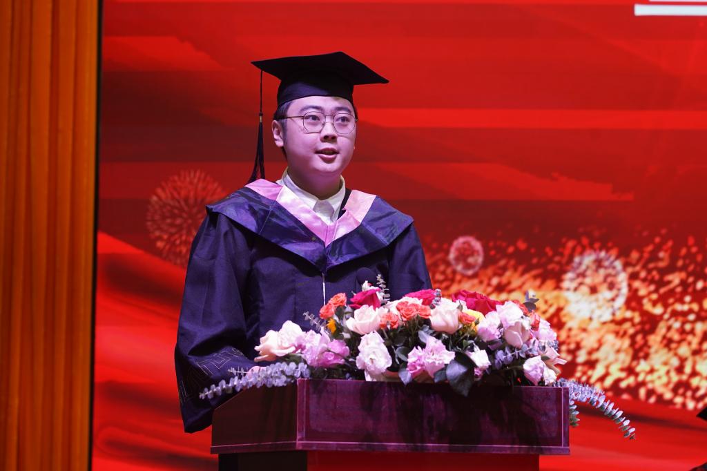 艺术与教育学院崔天辰同学代表毕业生发言,表达了对母校和老师的感激之情,希望大家努力成为不负时代、不负青春的强国栋梁。