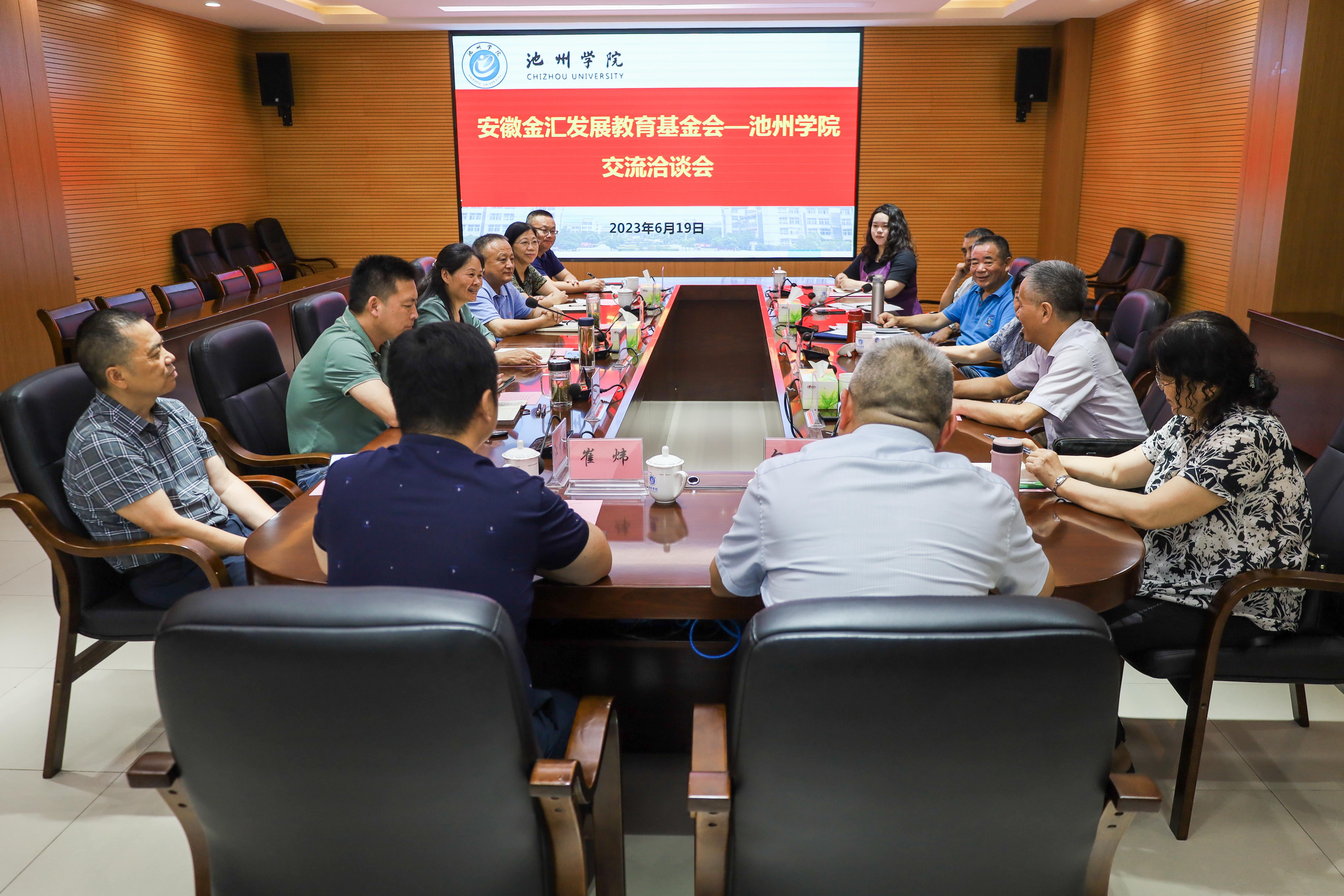 6月19日,安徽金汇发展教育基金会理事长王进、人民银行池州市中心支行党委书记、行长李成强一行来必赢官网洽谈合作事宜。党委副书记、院长郑兰荣主持召开座谈会,党委委员、副院长阳光宁参加会议。