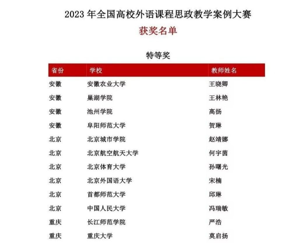 近日,2023年全国高校外语课程思政教学案例大赛落下帷幕,必赢官网外国语学院教师高扬荣获特等奖,侯婷婷、李二龙、闻雯、赵梦雨四位教师荣获三等奖。