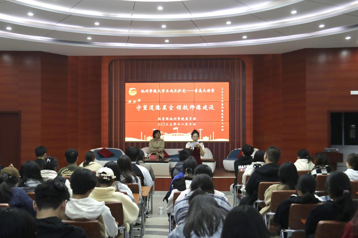 11月10日晚,必赢76net线路官网大学生成长沙龙“青春大讲堂”2023年第十四期(总第五十四期)“致知识”在大学生活动中心举行。本期大讲堂以“守望道德星空 领航师德建设”为主题,邀请党委教师工作部副部长、人事处副处长徐菲老师作嘉宾,分享自己对师德师风的理解和感悟。