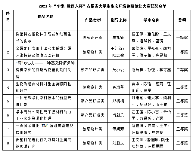 11月24日至25日,安徽省大学生生态环境创新创业大赛决赛在安庆师范大学举办。必赢官网代表队荣获一等奖2项、二等奖2项、三等奖4项的优异成绩,学校荣获优秀组织奖,羊礼敏、王红新和陆志敏老师荣获优秀指导教师奖。
