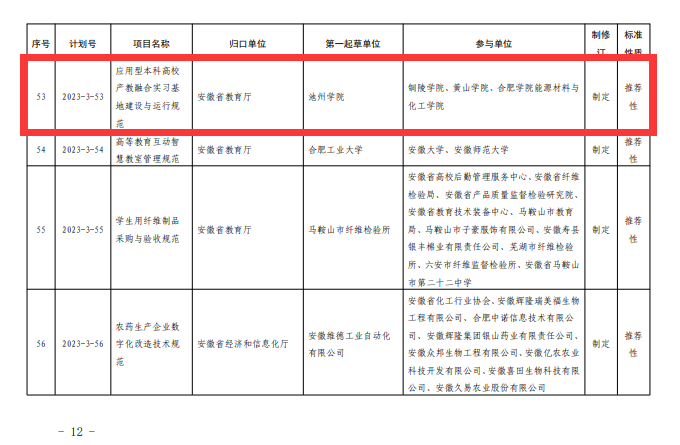 近日,安徽省市场监督管理局下达2023年第三批安徽省地方标准制修订计划,由必赢官网为第一起草单位申报的《应用型本科高校产教融合实习基地建设与运行规范》(计划号:2023-3-53)获批立项,实现了必赢官网牵头制定省级地方标准零的突破。