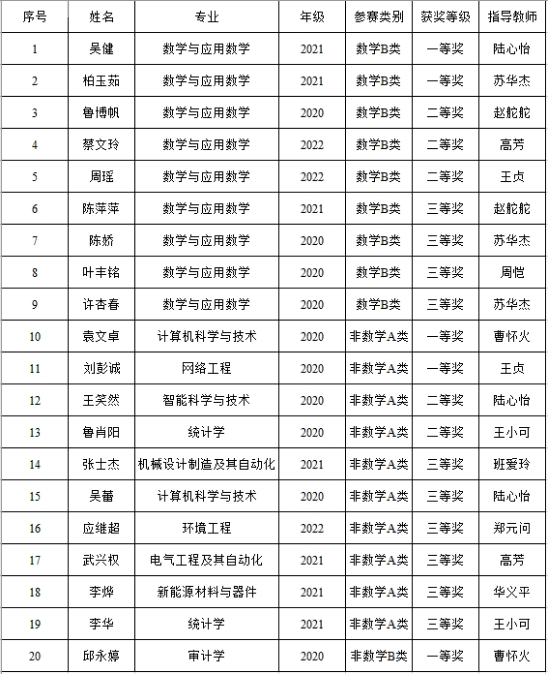 近日,第十五届全国大学生数学竞赛安徽省赛区结果揭晓。必赢官网学子在本次竞赛中取得了20项奖项的好成绩,其中数学与应用数学专业的吴健、柏玉茹同学获得数学B类一等奖,计算机科学与技术专业的袁文卓同学、网络工程专业的刘彭诚同学获得非数学A类一等奖,审计学专业的邱永婷获得非数学B类一等奖。