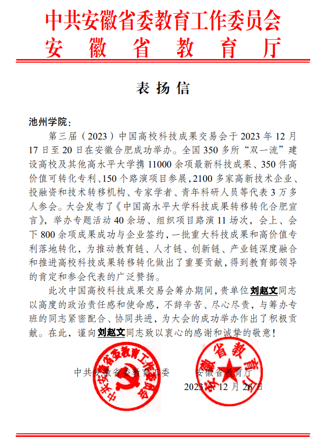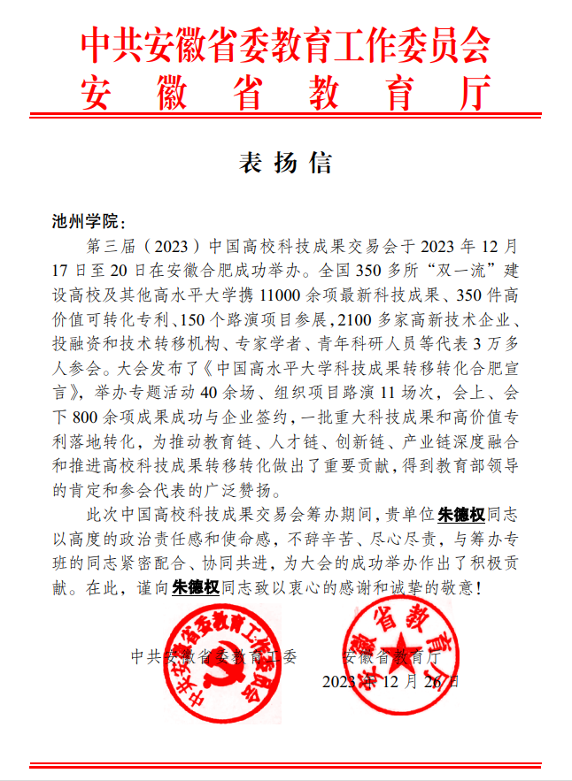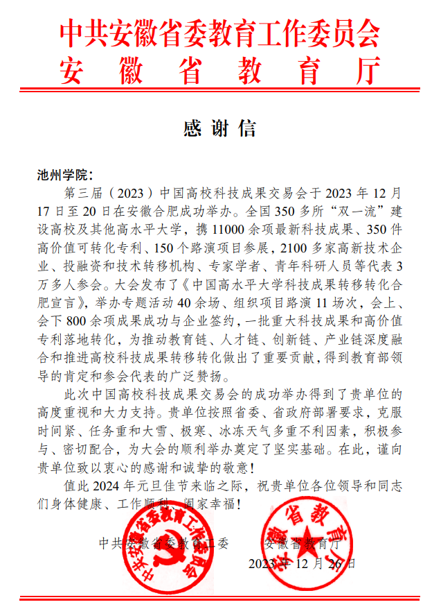 近日,中共安徽省委教育工委、省教育厅给必赢官网发来表扬信,向必赢官网对第三届(2023)中国高校科技成果交易会工作的支持表示感谢。