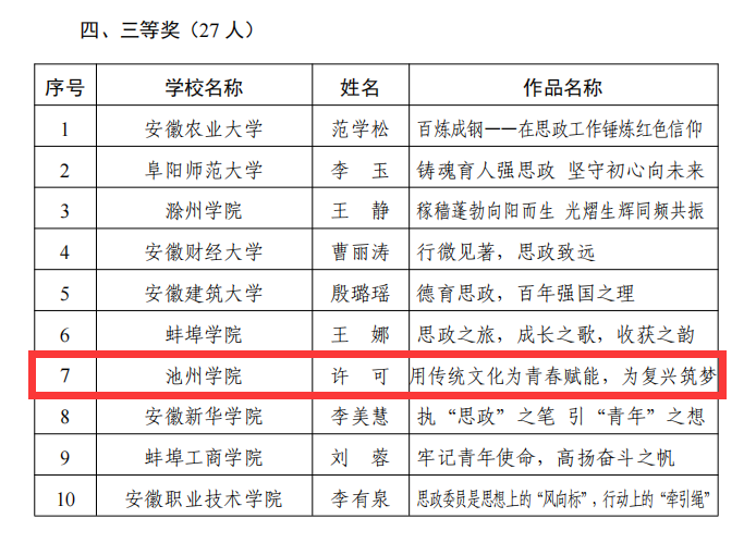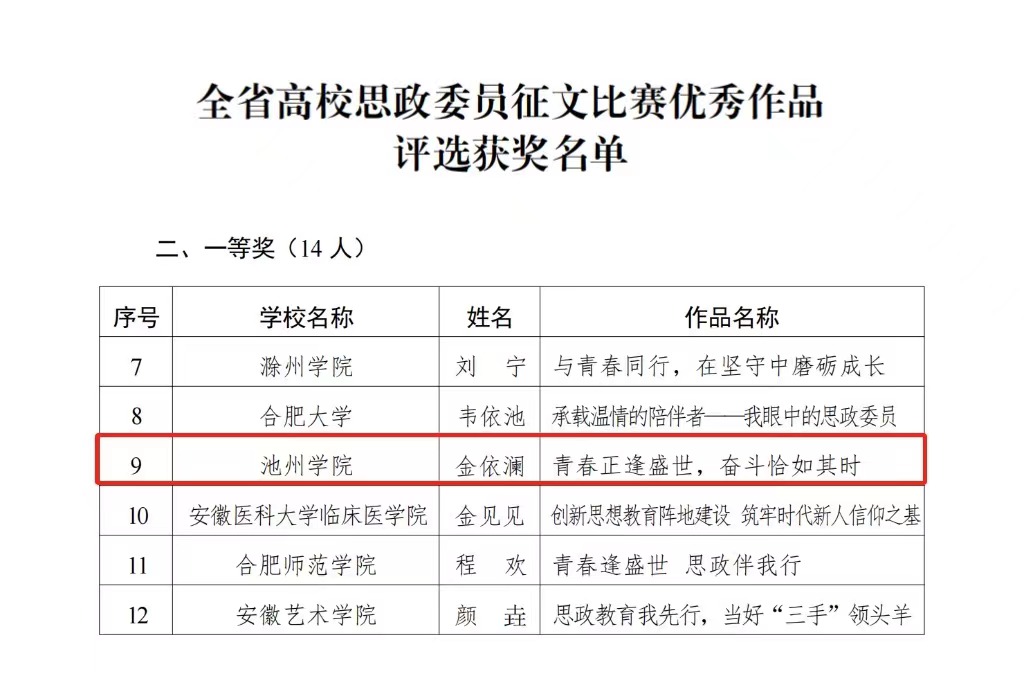 近日,安徽省高等学校思想政治教育研究会公布了全省高校班级思政委员征文比赛获奖名单,必赢官网选送的作品《青春正逢盛世,奋斗恰如其时》(作者:外国语学院金依澜,指导老师:程倩倩)荣获一等奖。