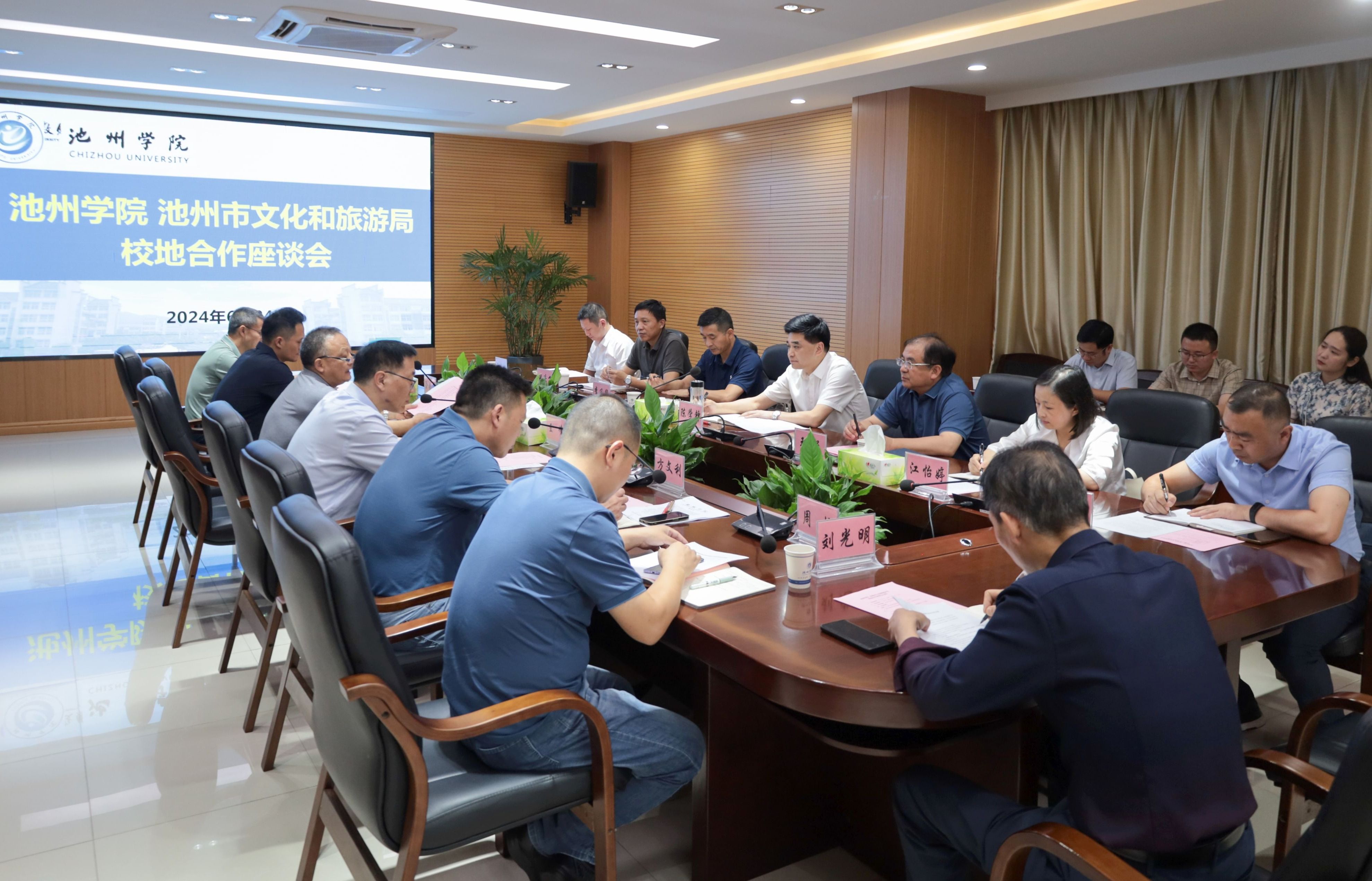 市文旅局班子成员、校办公室、科研处、教务处、旅游与历史文化学院、文学与传媒学院、艺术与教育学院、体育学院、外国语学院、皖南民俗文化研究中心负责人参加座谈。