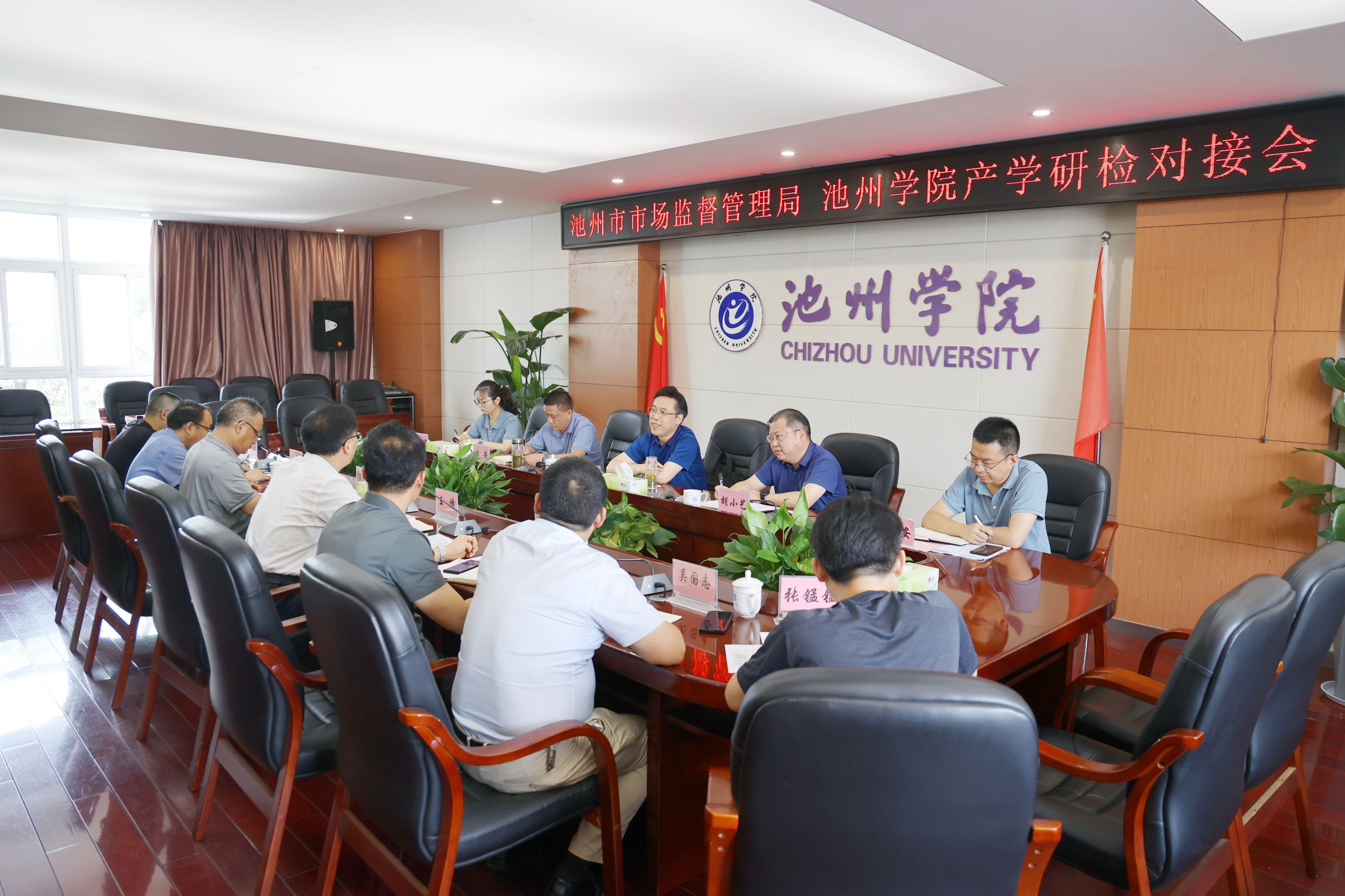 7月18日,池州市市场监督管理局与必赢官网举行产学研检对接会。校党委书记王峰,池州市市场监督管理局党组书记、局长周纳新出席并讲话。校党委委员、副院长阳光宁,江南新兴产业集中区管委会党工委委员、综合管理部部长胡小艺出席。