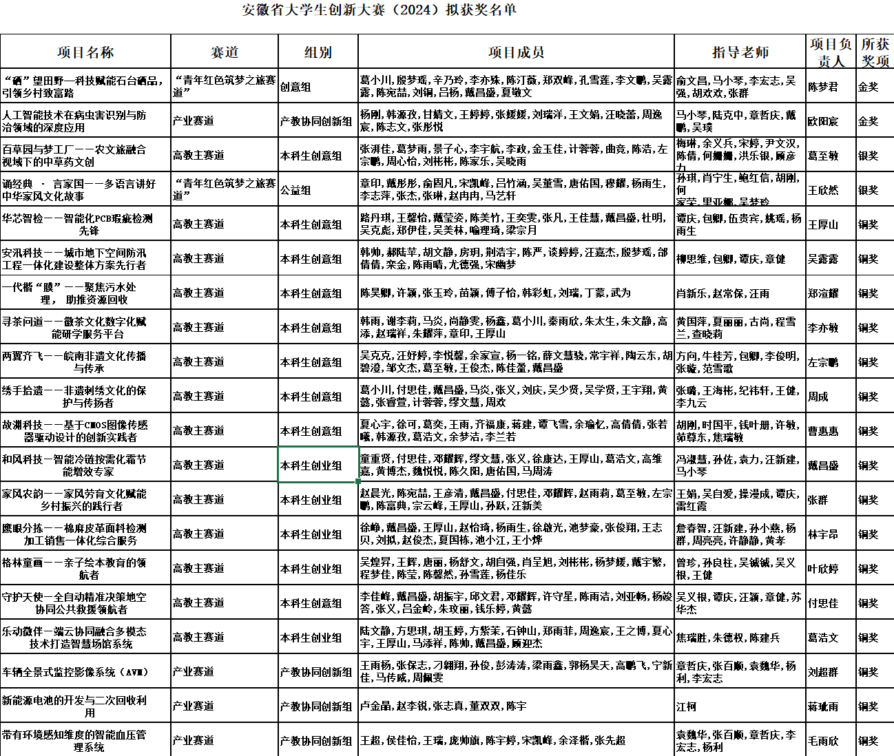 近日,安徽省大学生创新大赛(2024)组委会公布省大学生创新大赛(2024)获奖名单,必赢官网学生参赛作品获得省赛金奖2项、银奖2项、铜奖16项,获奖数量有较大提升,获奖项目与“四新”建设和地方优势产业紧密结合,充分展现了学校创新创业教育的成效。