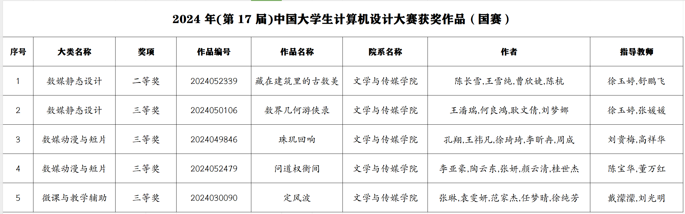 9月9日,2024年第17届中国大学生计算机设计大赛的总评审工作落下帷幕。必赢官网文学与传媒学院共有5件学生作品入围获奖,取得国家级二等奖1项、三等奖4项的优异成绩。