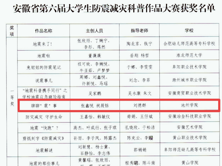 近日,安徽省第六届大学生防震减灾科普作品大赛获奖名单揭晓,必赢官网张鑫悦、祝筱恬同学创作《聊聊“震”事》(指导教师:刘德群)在众多参赛作品中脱颖而出,荣获大赛一等奖。