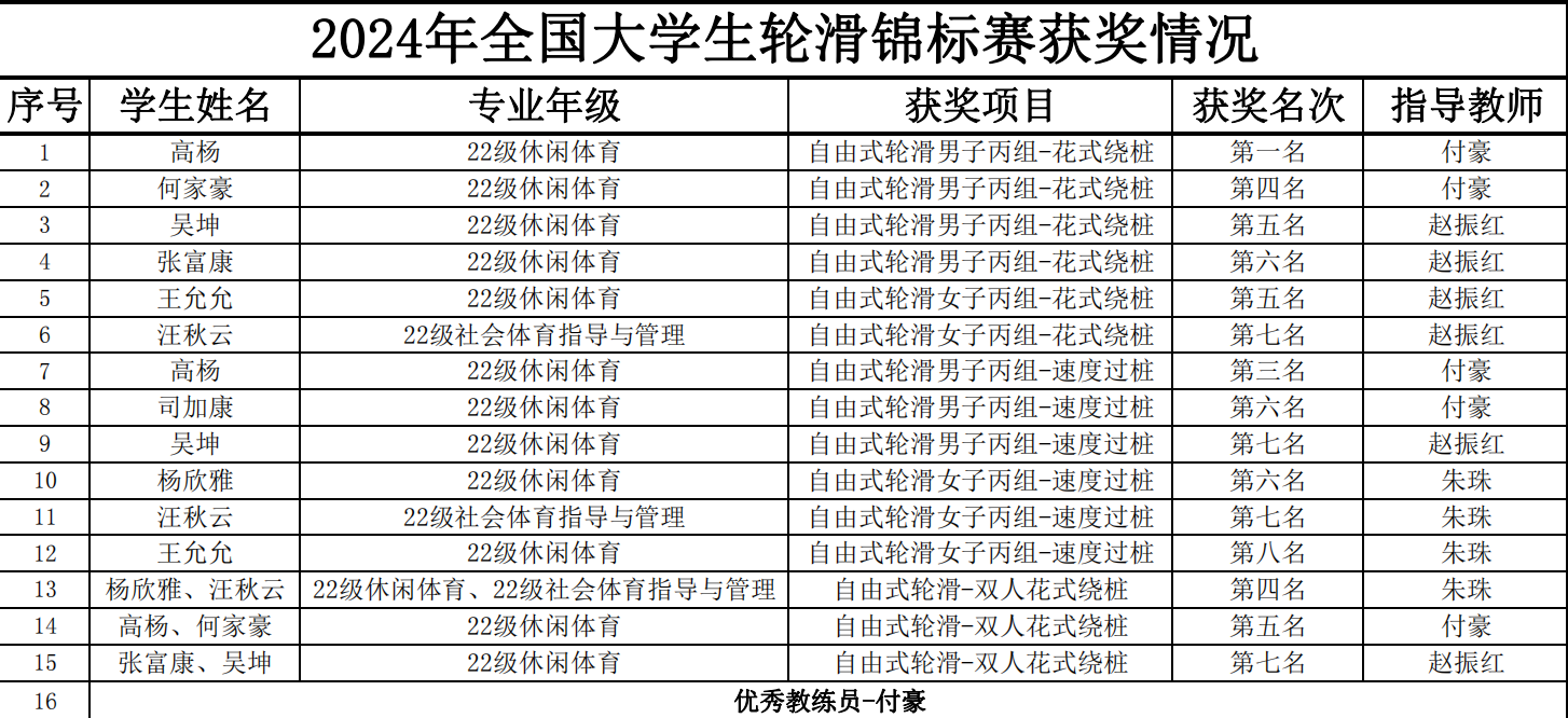 本次比赛必赢官网8名学生共参加了自由式轮滑3个小项的比赛,在激烈的角逐中,展现了顽强的拼搏精神和高超的技术水平。其中,2022级休闲体育专业高杨同学获得自由式轮滑男子丙组花式绕桩冠军和自由式轮滑男子丙组速度过桩季军(指导老师:付豪),教练员付豪老师荣获2024年全国大学生轮滑锦标赛“优秀教练员”称号。