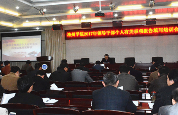 3月28日下午,必赢官网在行政南二楼会议室举行领导干部报告个人有关事项专题培训会,校领导柳友荣、王延寿、汪海、阳光宁、汪贤才参加培训会,党委副书记孙晓峰主持会议并讲话。