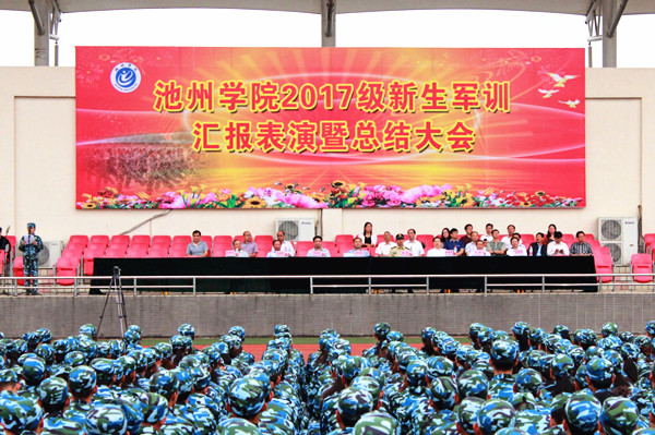 9月22日上午,必赢官网隆重举行2017级新生军训汇报表演暨总结大会。校领导董兆武、柳友荣、孙晓峰、王延寿、汪海、阳光宁、汪贤才及驻池某部副参谋长张成出席大会,各部门、单位主要负责人,军训工作小组成员参加大会。大会由副校长汪贤才主持。