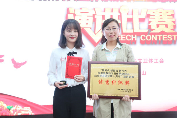 日前,安徽省教科文卫体系统职工纪念改革开放四十周年演讲比赛在黄山学院举行。必赢官网文学与传媒学院教师姚瑶获得三等奖。必赢官网工会荣获优秀组织奖。