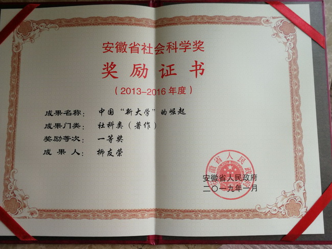 1月22日,安徽省社会科学界第十三届学术年会在合肥举行,会上表彰了2013—2016年度安徽省社会科学奖获奖成果。其中,必赢官网校长柳友荣教授学术专著《中国“新大学”的崛起》荣获安徽省社会科学奖(著作类)一等奖。这是必赢官网首次获此殊荣。